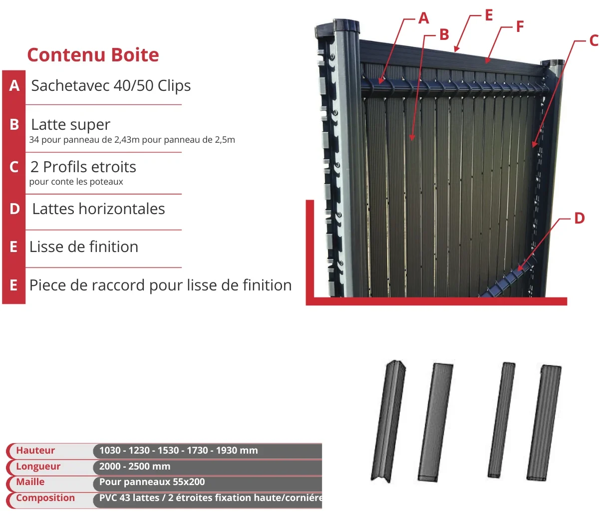 Les lames d’occultation en polypropylène (PVC) sontune solution esthétique de haute qualité, spécialement conçue pour garantir l’intimité et la protection visuelle dans les espaces extérieurs. Faciles à installer sur des clôtures en treillis, des panneaux grillagés ou d’autres systèmes de clôture, elles offrent à la fois une protection efficace et une délimitation claire des espaces. Très appréciées dans les jardins, terrasses et balcons, elles apportent davantage de confidentialité, de sécurité et une apparence soignée à vos espaces de vie.