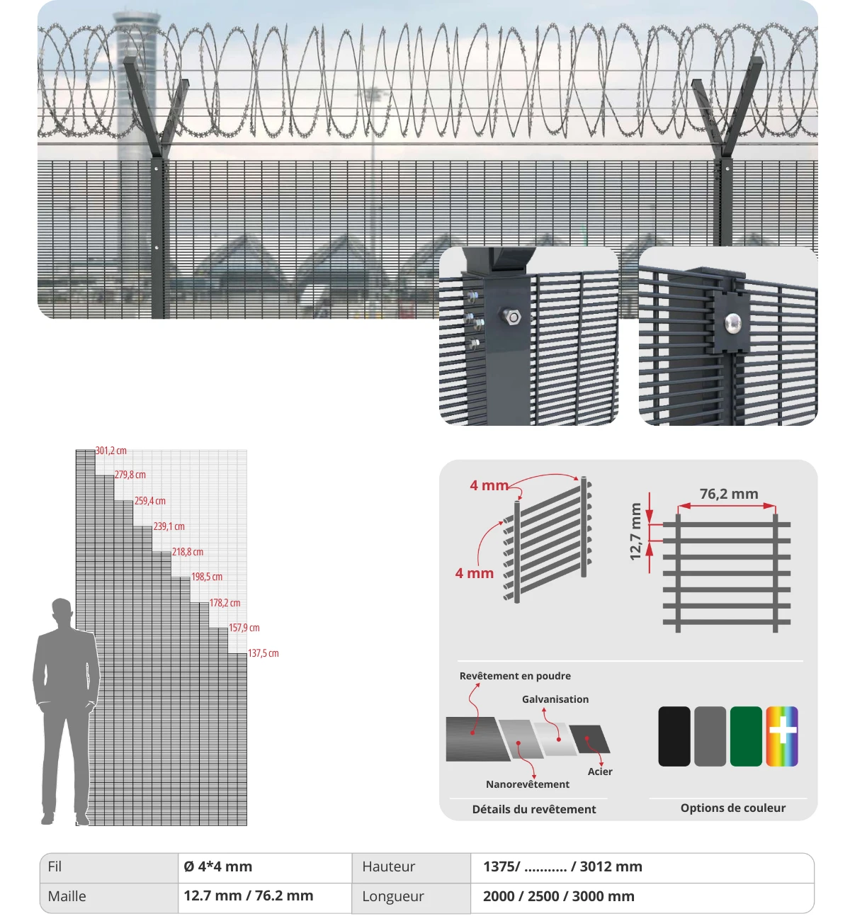 Un panneau de haute sécurité est un système de clôture spécialement développé pour les zones ayant les exigences de sécurité les plus élevées, telles que les installations militaires, les aéroports, les centrales électriques et les prisons. La construction robuste et les mesures supplémentaires telles que les barbelés rendent difficile l’escalade, la coupe ou le dépassement.